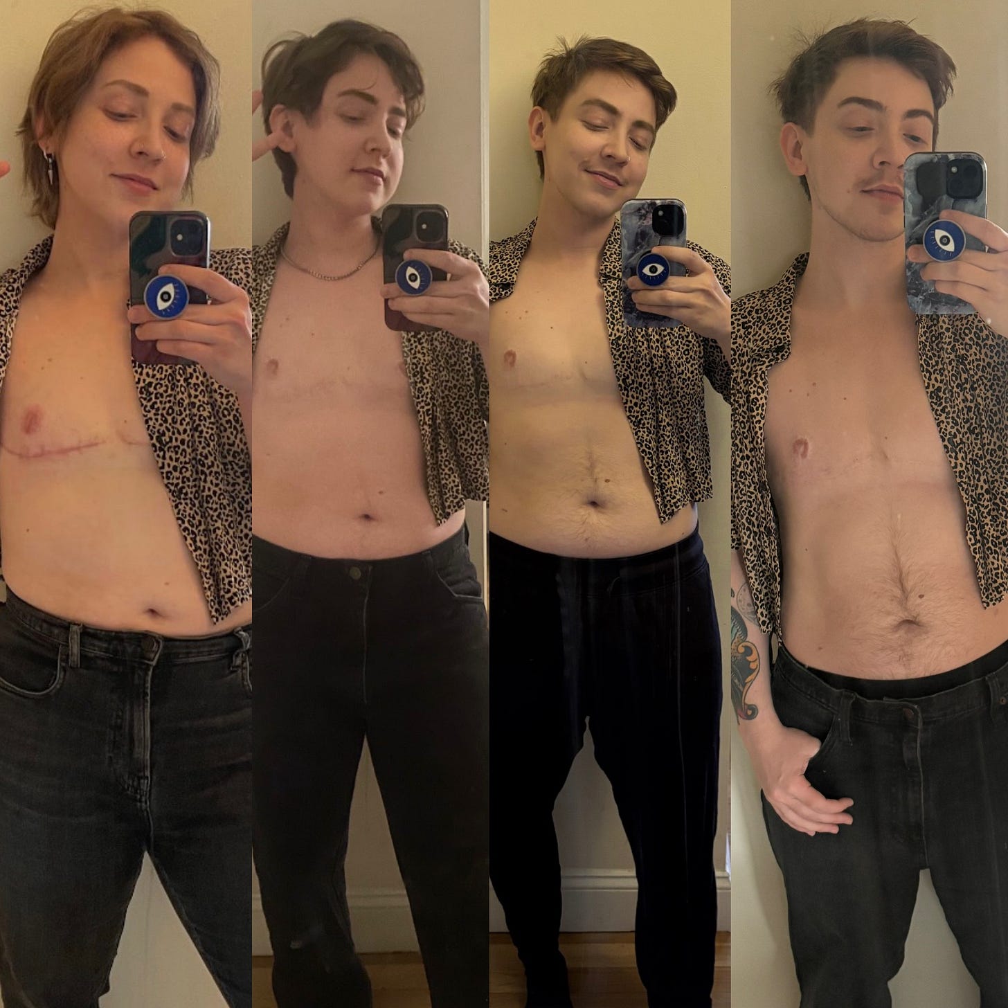 “Getting here has been excruciating. I’ve spent the past year doing pretty much nothing but transition. I stopped posting Reels and TikToks almost entirely, mostly because I felt too fragile to even give a chance for strangers to comment on my life. I fell off doing comedy in person, I tried and failed to get a full-time job, I isolated from friends— and most of these things happened because I couldn’t bear to go out into a world that I knew didn’t see me how I saw me. Being depressed about transition not changing me enough became a full-time job. Someday, when I have a job and a comedy career, maybe I’ll see it as more of a cocoon year and less of a flop year. For now, I’m trying to pick up the pieces of what dysphoria destroyed.”